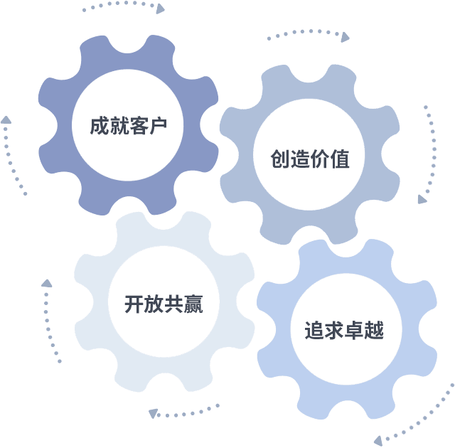 成就客户是一切决策的出发点,,,创造价值是衡量所有工作的标准,,追求卓越是我们做事做人的态度,,,,开放共赢是我们的格局也是最终的结果。。价值观的齿轮环环相扣,,推动着组织里的每个人不断向前。。。。